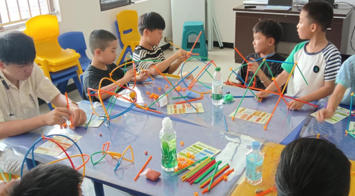 图为小朋友们开始使用吸管玩具来搭建作品。周明杰摄