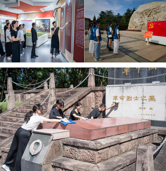 在芜湖市烈士陵园与合肥市烈士陵园,志愿服务队全体队员整齐列队,手持工具仔细为烈士擦拭墓碑,以庄重行动向英勇献身的革命先烈表达深切缅怀与崇高敬意。在庄严肃穆的纪念碑前,队员们宣读入党誓词,铿锵有力的誓言回荡空中,彰显“青春挺膺正当时”的坚定信念。通过沉浸式的现场学习与详实动情的讲解,队员们深入了解了革命先辈的感人事迹,深刻体悟伟大抗战精神的时代价值,进一步激发了爱国热情与使命担当。