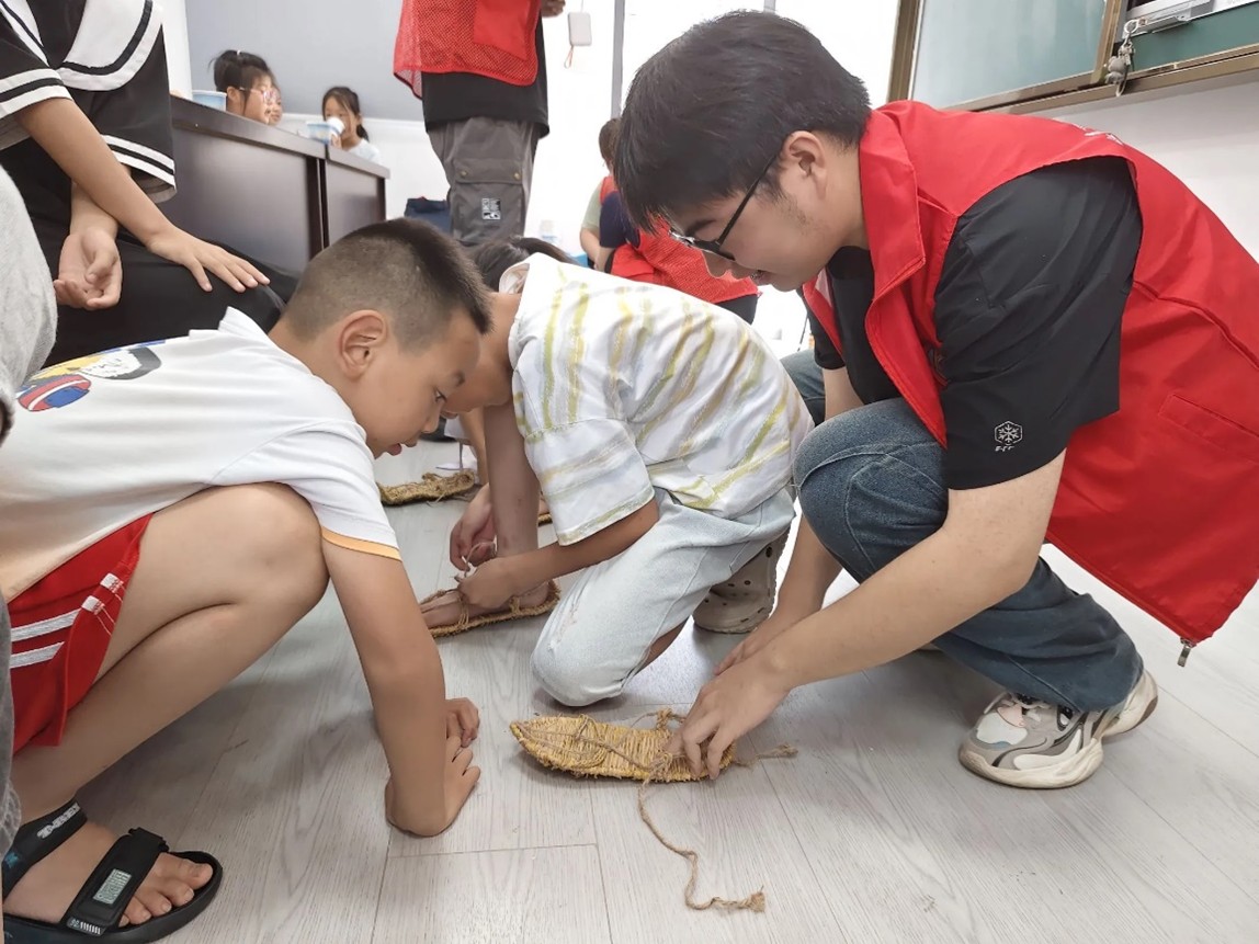 图为志愿队员向孩子们展示红军草鞋制作工艺