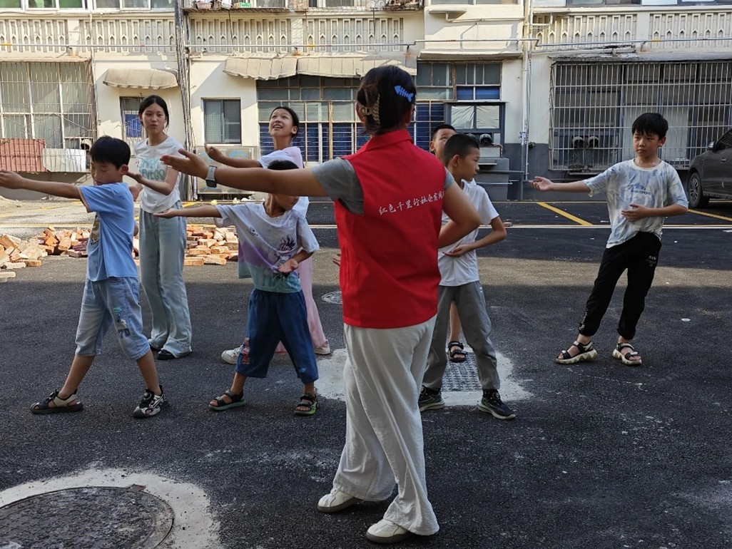 “左手如抱球,右手慢慢推......”在户外场地上,志愿队员带领孩子们练习太极九式。他们解释道:“红军用草药强身,我们用太极健体,健康是革命的本钱。”一招一式间,传统文化与红色精神得到了完美融合。