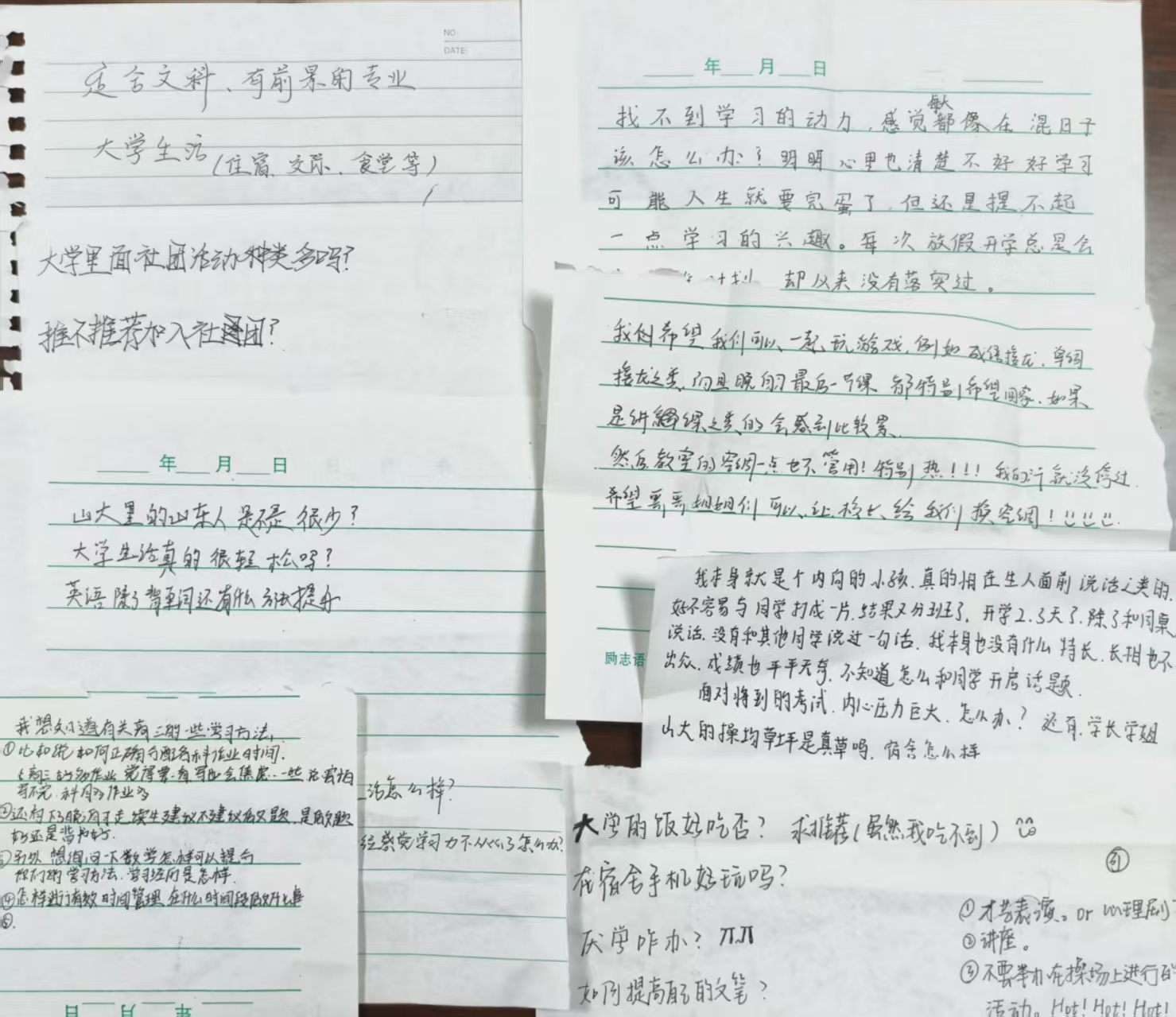 山东大学(青岛)学生小树林支教调研团青苗支教队和聊韵薪火支教队的队员们根据收集到的问题和反馈,精心设计了11份分享PPT,涵盖了学科学习方法、大学生活、专业选择、心理调节等多个板块。在10天的时间里,队员们在各个班内开展分享会,足迹遍布冠县一中高三年级的22个班级,覆盖1700余名学子,有效解决了同学们的疑惑,助力他们合理安排复习计划,尽快适应高三节奏。