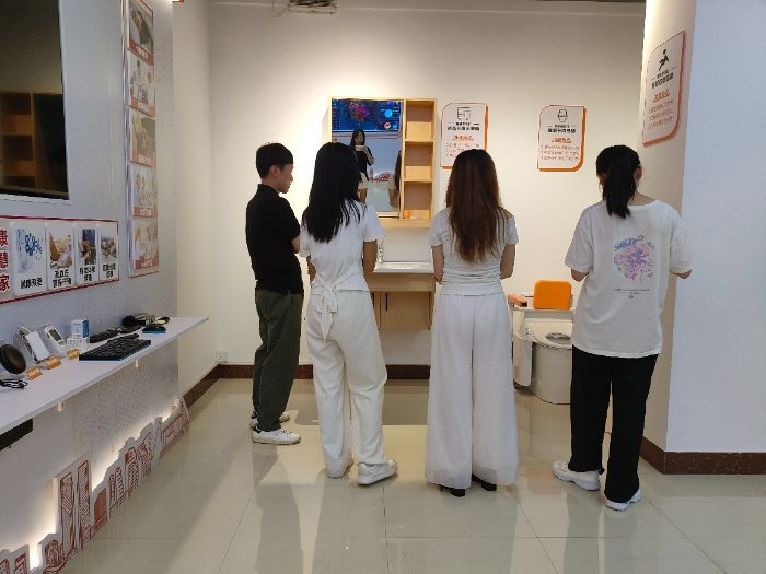 图为团队成员了解智能养老用品。刘佳乐 供图