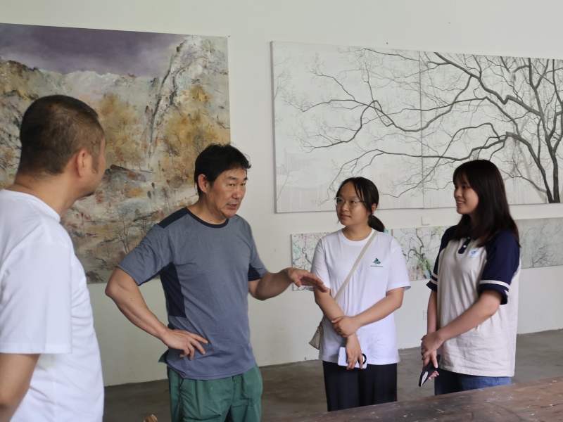 7月11日下午第一站,实践队走进草坝镇塘坝村开展田野调研。通过走访“厚山房”“秋明山庄”及村内艺术民宿集群,队员们与艺术家廉学洺、叶宗明深入交流,了解二人如何将村内老木梁、茶园枯枝等闲置资源转化为艺术装置,以藏茶膏绘画、工笔画还原茶马古道文化;重点考察“艺术家引导+村民参与”的共创模式,包括廉学洺开设的免费油画班、叶宗明的木板画课程,以及这些活动如何带动400余名村民参与创作,形成“艺术创作+民宿承载+研学赋能”的乡村振兴模式。