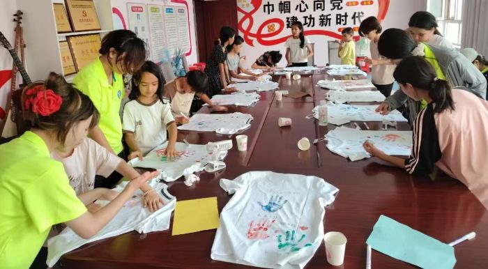 “巧手绘非遗”手工制作活动则将美育与传统文化传承相结合。志愿者们带领孩子们学习体验当地非遗项目元素或通用手工技艺,一起用颜料、布料、环保材料等创作属于自己的表演服装和手工作品。照片记录下了这温馨的一幕:社区活动室里,志愿者们和孩子们围坐在桌前,埋头创作,交流互动,一幅幅充满童真想象力的图案跃然于T恤之上。这不仅锻炼了孩子们的动手能力和创造力,更增强了他们对民族文化的认同感。