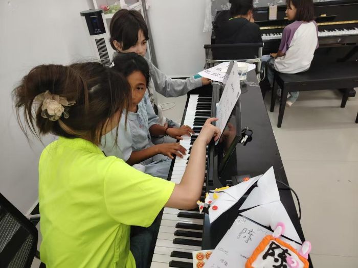 实践过程中,志愿者们将专业知识转化为生动有趣的实践活动。 在“奇妙的琴键”钢琴启蒙课上,志愿者们从最简单的音符、指法开始,耐心地一对一指导从未接触过钢琴的孩子们。照片中,志愿者俯身在一旁,轻轻握着孩子的手,引导其在键盘上按下正确的音符,孩子全神贯注,眼中充满了对音乐世界的好奇与探索的渴望。短短数日,一些孩子已能弹奏出《小星星》等简单旋律,成就感溢于言表。