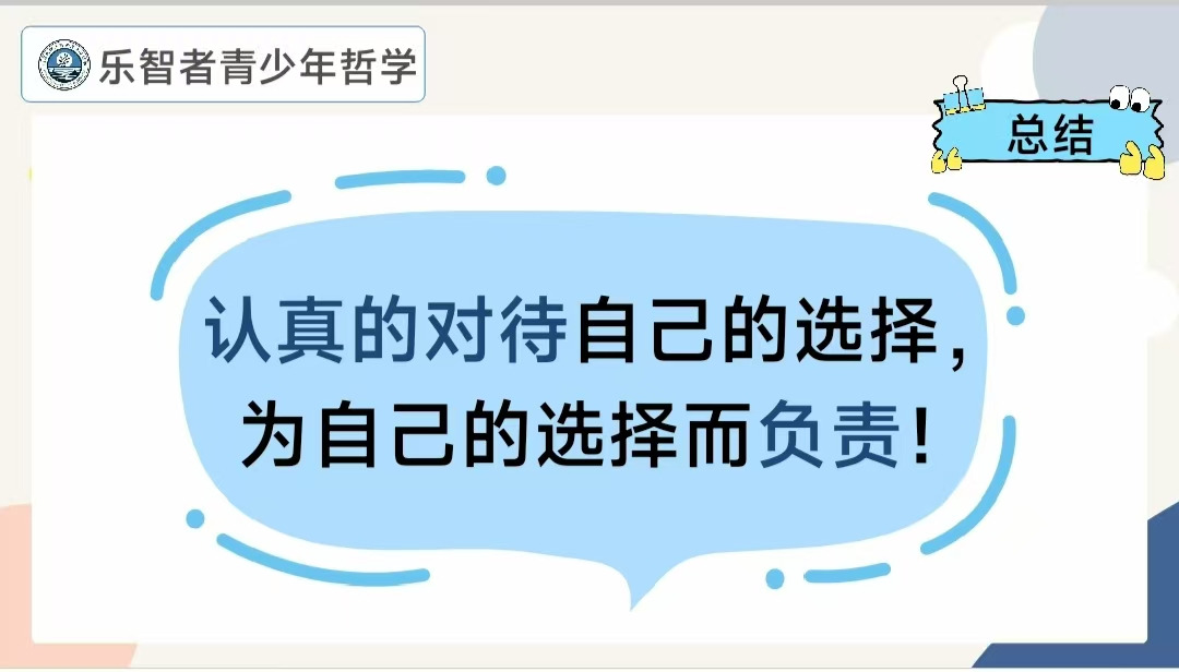 在课堂的最后,范老师将同学们从哲学思考拉回到日常生活之中,通过一则校园霸凌实例告诉同学们,袖手旁观并不是正确的选择,只有正视并承担自己的责任才能做出正确的选择。“认真对待自己的选择,为自己的选择而负责。