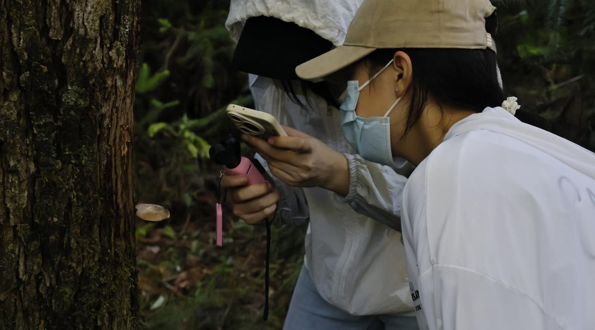(图为漆彩阳光实践队近距离观察并拍摄割漆过程。方盼盼 供图)