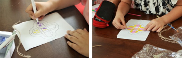 图为竹编风铃课堂:左为童画设计,右为竹篾贴合