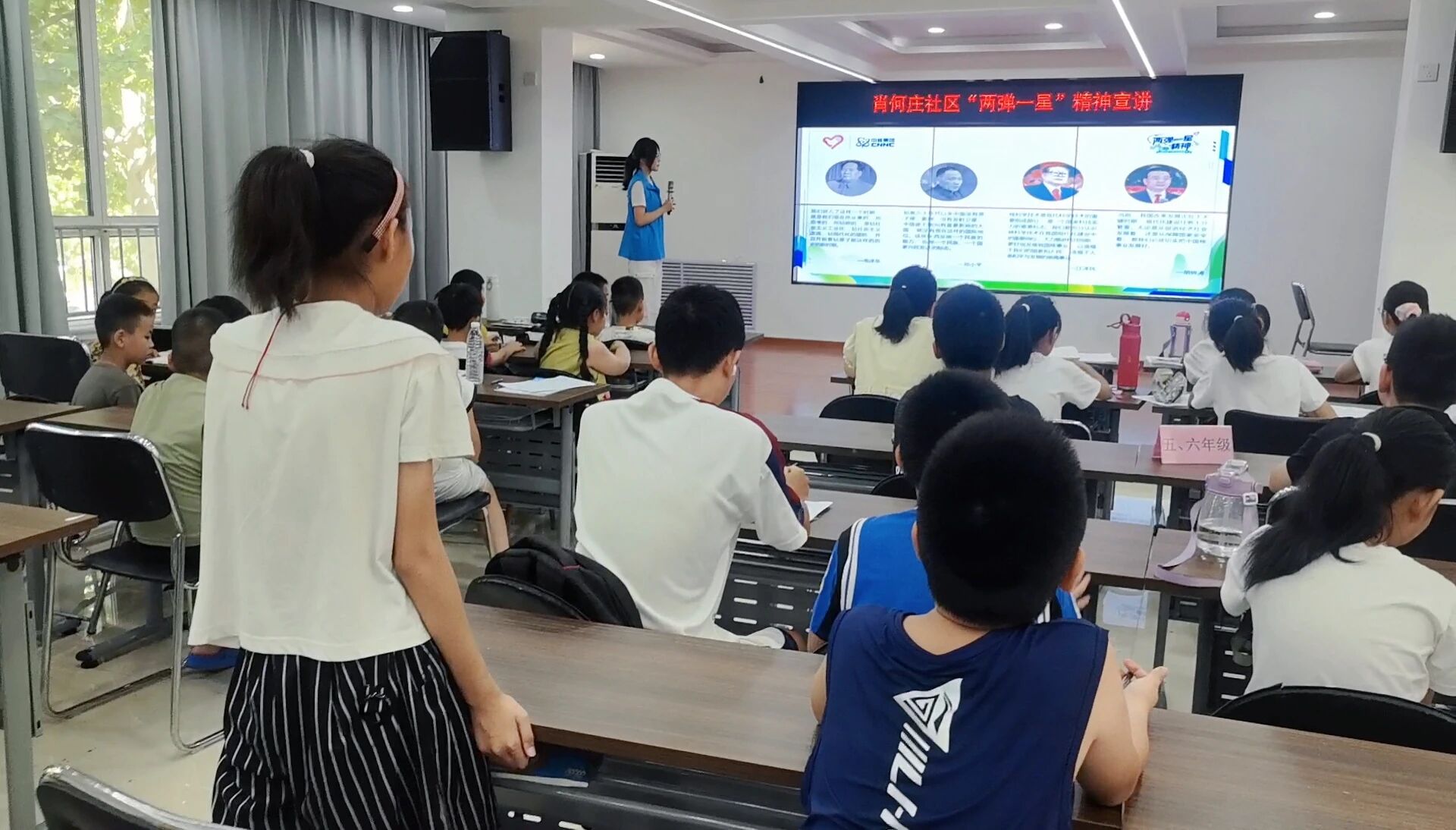 宣讲过程中,志愿者首先通过一段视频向青少年展示“两弹一星”事业发展的艰辛历程,随后用通俗易懂的语言讲述新中国成立初期面临的种种困难,再到科研人员们如何克服重重挑战,最后成功研制出原子弹、氢弹和人造卫星。志愿者还提到为国家机密而隐性埋名多年的邓稼先、在飞机失事时用生命守护机密文件的郭永怀以及在艰苦环境中默默坚持研究的于敏。科研人员在困境中坚持国家利益至上、默默奉献的精神,让青少年眼中闪烁着光芒。