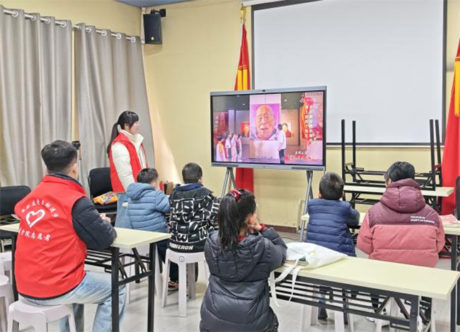 为厚植孩子们的爱国情怀,丰富精神文化生活,实践团开展红色文化浸润活动。红色影片观看环节,孩子们共同观看经典红色短片,志愿者结合《老红军的故事》内容讲述红色小故事,引导孩子们铭记革命历史,传承红色基因,在幼小的心灵中播下爱国爱党种子。