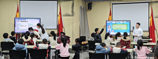 在医学知识科普方面,海姆立克急救小课堂上,志愿者们用“剪刀石头布”趣味定位法讲解操作要点,借助模拟道具演示异物卡喉的急救流程,带领孩子们分组实操、两两模拟,手把手纠正动作,让孩子们快速掌握这一“救命技能”。同时,志愿者们细致讲解传染病预防知识,从勤洗手、戴口罩、常通风等日常细节入手,通过视频+讲解的方式让孩子们学习七步洗手法,教孩子们养成良好的卫生习惯,为健康成长筑牢防护墙。