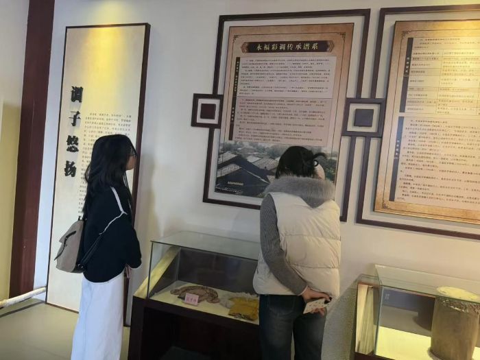 在永福博物馆,实践团成员走进彩调专属展区,近距离接触各类珍贵展品。从老艺人的演出影像资料,到绣工精美的戏服、古朴的伴奏道具,再到不同年代的剧本刻本与荣誉证书,一件件实物生动还原了彩调的发展历程。队员们跟随讲解员认真参观,详细记录展品背后的故事,并与工作人员围绕彩调保护传承展开交流,深入探讨当下非遗发展面临的挑战,进一步加深了对彩调文化价值的认知。