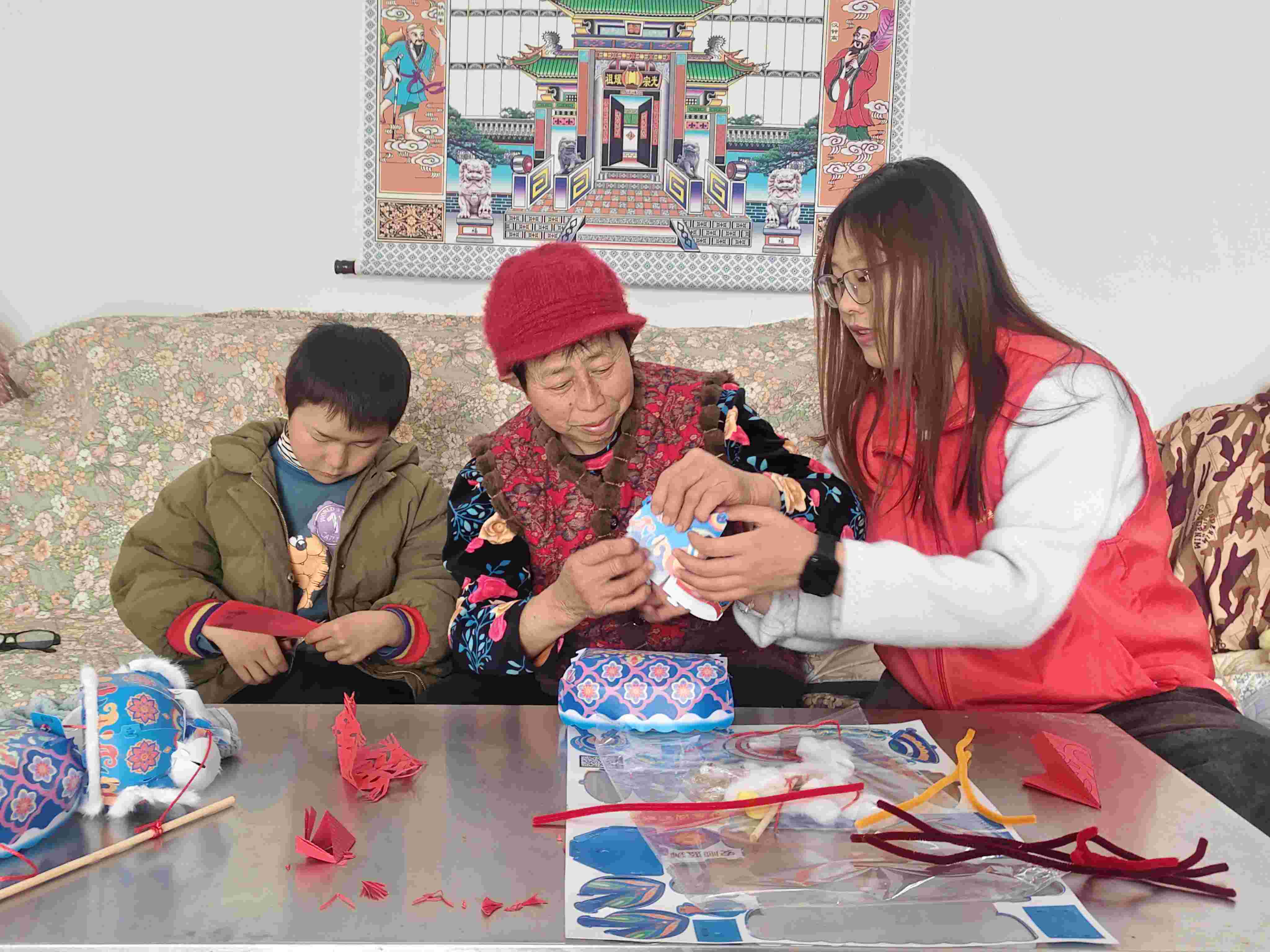 活动当天,服务队成员深入村民家中开展非遗手作教学实践。志愿者以通俗易懂的语言,细致讲解醒狮灯笼的文化寓意、剪纸窗花的传统技艺与扭扭棒创意制作方法,与孩子们和老人们一同动手创作,在互动中感受传统民俗的独特魅力。期间,志愿者们与老人亲切交谈、倾听心声,聆听老人们讲述过往的新春故事,在温情交流中拉近心与心的距离。大家还一同为老人家中张贴亲手制作的窗花,并将共同完成的醒狮灯笼、剪纸窗花等手作作品作为新春礼物赠予他们,为家中增添喜庆祥和的节日氛围。此外,服务队还组织开展主题分享会,鼓励孩子们与老人们分享手作过程中的乐趣与真切感受,进一步增进情感交流与文化体验。