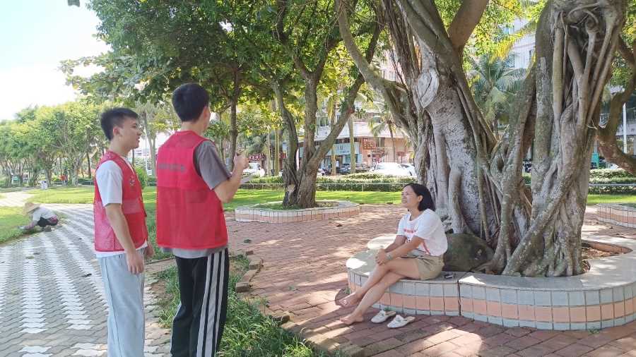 在活动的过程中,湛江的天气非常高温炎热,但是我们没有退缩,坚持把实践任务做完。在公园里重复走了三次,不断询问过往路人居民,只为更好地收集信息。在面对难题,挑战难题过程中,我们感受到了成长与实践的意义。这样的一天是充实而短暂的,坐上汽车,望着窗外缓缓下沉的夕阳,我们继续着下一站的旅途。