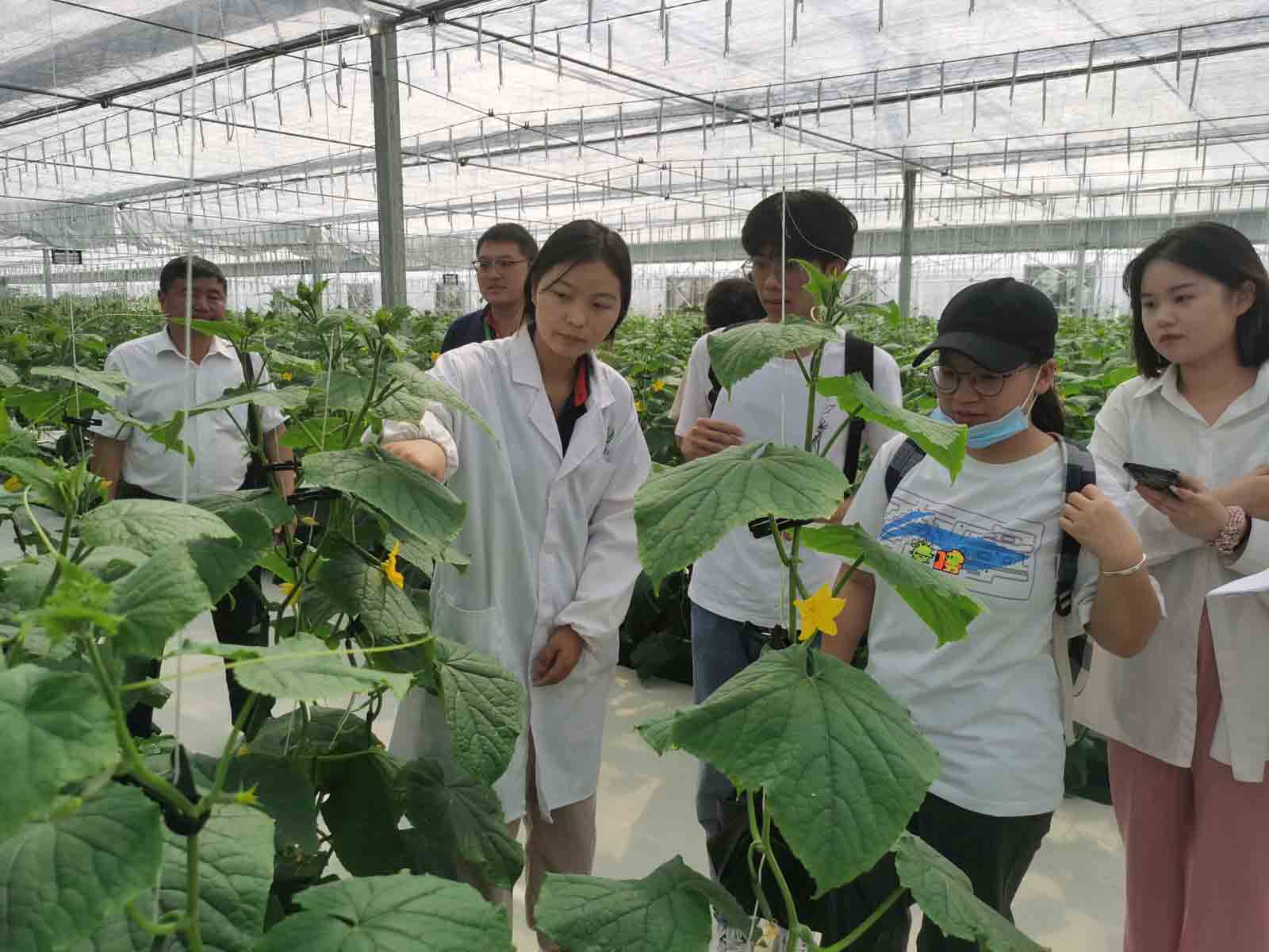 图为实践队师生在技术人员带领下参观大棚蔬菜