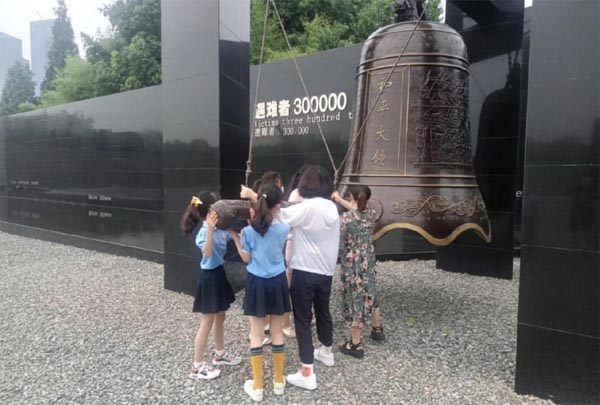 图为青少年在家长的陪同下敲响这一和平大钟,敲响这一大钟,警醒着我们和平来之不易,要时刻铭记历史,缅怀先烈!