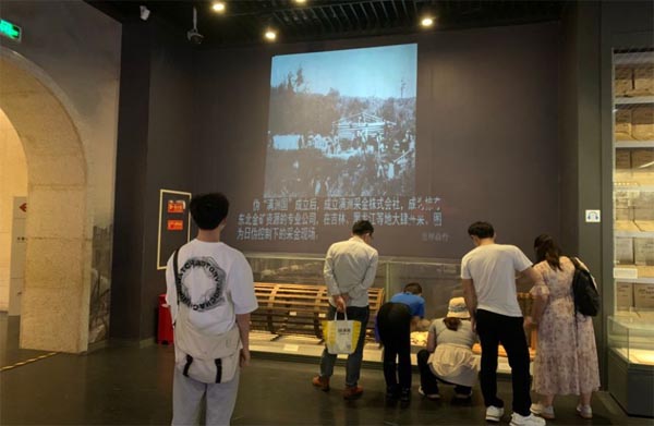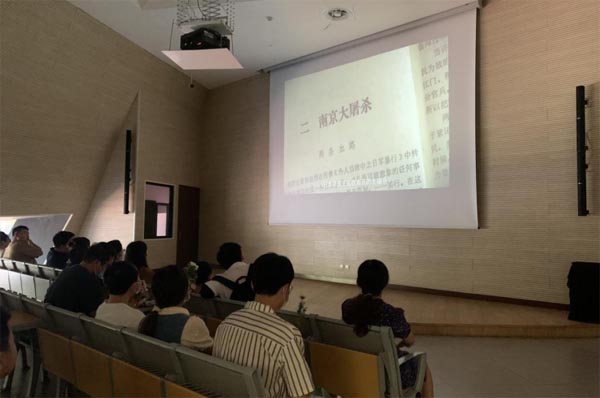 图为小组成员在馆内通过视频资料学习相关历史知识