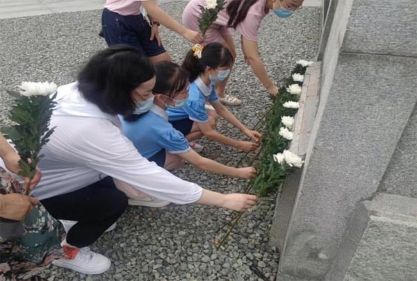 图为小组成员在馆内遇见各种不同年龄阶段的人们为在这一悲痛的历史事件中的遇难同胞们献花默哀
