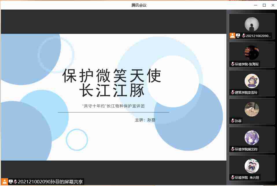 为积极宣传长江生态大保护的重要意义,引导大学生们了解并关爱和保护“水中熊猫”——长江江豚,8月10日晚,团队宣传组开展《保护微笑天使-长江江豚》科普云课堂。学院团委负责人陈亚会、团队指导教师杨静、学院各年级学生以及兄弟院校多名学生等参加。