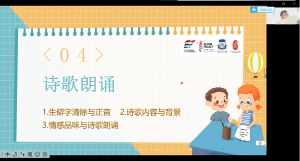 朗诵练习有利于帮助学生提高普通话水平,增强普通话兴趣并提高审美能力,为此,陈吉丽开展了以“朗诵技巧”为主题的推普课程。此课程在学生普通话听说读写能力都比较强的前提下开展,以提高学生使用普通话的语言能力为目标,使学生在课堂中更好地感受普通话的魅力,培养对普通话的兴趣和热情,激发学生对民族通用语言的认同感和自信心。