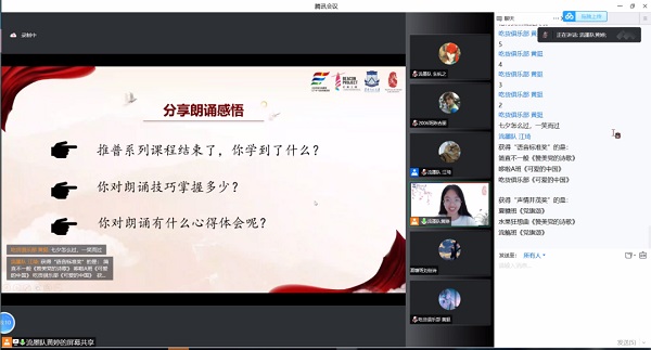 在教学过程中,陈吉丽引用经典红色诗歌《七律长征》,结合朗诵知识和技巧带领学生们认识诗歌魅力和红色党史,并鼓励学生开麦朗诵爱国诗歌。其中,何心蕊、何锐珊等同学主动开麦朗诵,感情饱满,语调丰富,读出了青年的神采志向,读出了伟大红军的气魄豪情。陈吉丽表示,“希望同学们能从字里行间领悟爱国精神,培养爱国情怀,从而激发同学们努力学习、将来投身于建设祖国的热情。”