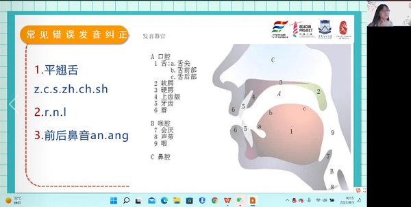 在教学过程中,黄婷重点讲解了普通话的“前世”,结合引用典例、翻译文献等方式,带领学生们梳理普通话的发展历程,并整理归纳了普通话的发展简史。学生们反响热烈,对普通话的发展表现出强烈兴趣,在腾讯会议聊天区踊跃表达自己对普通话的认识与疑问,并得到了教师的鼓励与解答。