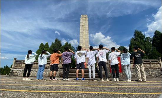 慕名而来的游客络绎不绝,三河坝战役纪念馆里热闹非常。队员们站在朱德元帅的讲话摘录前默读,那是为红军指向游击战、走向农村、走向群众的讲话。一读将军之言,方知红军成长的曲折。纪念馆外可以饱览梅江、汀江、韩江的美景,可以看到江河交错、地形复杂,远处江河泾渭分明,逶迤起伏气势磅礴,相携相拥奔涌远去。实践队员拾级而上,来到笔枝尾山顶,瞻仰三河坝战役烈士纪念碑。碑身正面镌刻着朱德元帅题写的碑名“八一起义军三河坝战役烈士纪念碑”正楷鎏金字。晓之以碑,动之以情,队员们一字排开,共同瞻仰以血汗浇筑新中国的千万军魂,将先辈生生不息的铸就精神铭记于心。