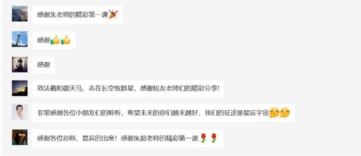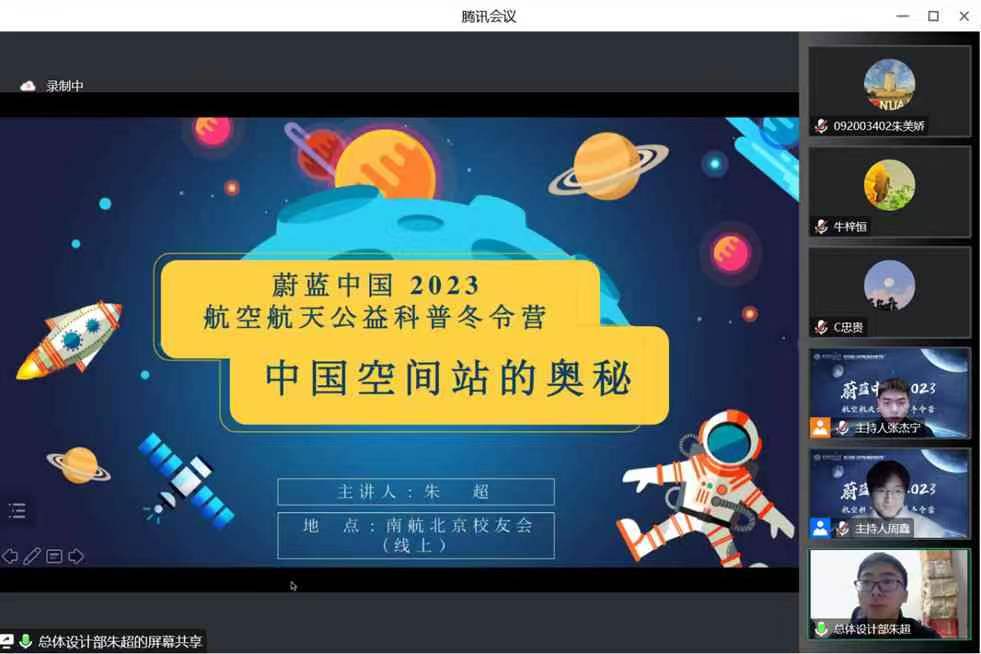 热烈的互动讨论环节之后,主持人宣布“蔚蓝中国2023”航空航天公益科普冬令营正式开营。随之而来的是精彩的开营第一课。此次课程有幸邀请到了南航北京校友会杰出校友代表朱超,朱超老师2015年毕业于南航飞行器设计专业,现就职于航天五院总体设计部,主要负责中国空间站和深空探测空间机械臂总体设计。曾经给中国航天员多次授课,多次接受央视和中国航天报采访,也与中科院、文昌科普基地、北京双榆树小学和人大附中本部一起合作航天科普课程。同学们在课程中收获满满,也获得了许多启发,对中国空间站的了解更进一步。同时,本次课程受到家长的广泛好评与反馈!