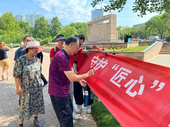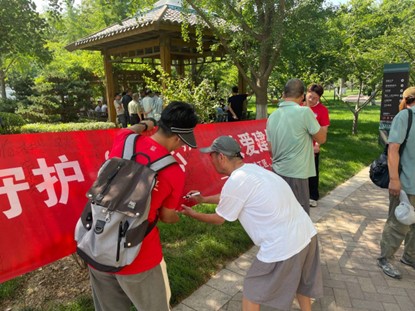 7月11日“情系筑城工匠,砼辈奋楫笃行”社会实践团队前往山东省淄博市人民公园开展群众动员工作。在得到园区管理人员允许后,活动正式开始。活动伊始,“情系筑城工匠,砼辈奋楫笃行”社会实践调研团在人民公园内悬挂宣传标语,并对市民就关爱建筑工人话题进行采访,以此来了解现代社会人民群众对建筑工人的态度及关注程度。与此同时,实践团成员邀请市民在横幅上签字,以此来提高市民对建筑工人的关注。在实践团队队员的动员下,市民们情绪高涨,热情的发表了对建筑工人行业的看法。