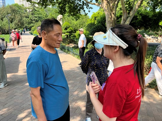 实践队员们各司其职,积极主动地邀请在公园晨练的市民们来参加活动,给市民们讲述活动的流程和目的,希望人们增加对建筑工人职业的认知和尊重。实践队员和市民们的互相配合,吸引了更多的群众,更多市民自发地前来参加活动,现场气氛一片和谐。队员们对一些市民进行了采访,一位市民向队员们讲述了曾经他作为一名建筑工人的工作日常,并提到作为建筑工人是一件很骄傲的事,因为这是在为国家的建筑事业添砖加瓦。