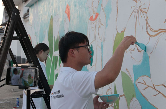 实践队成员手拿绘画工具、颜料桶,耐心定位、勾线、调色、上色,在他们繁忙而有序的勾勒下,一幅幅精致的绘画与墙体巧妙融合,让原本冰冷单调的墙面变成了乡村中美丽的画卷。尽管实践期间时而烈日当头,时而狂风暴雨大作,他们手中的画笔却没有丝毫停歇的趋势,当笔尖沾上斑斓的色彩,笔刷在指尖跳跃、徘徊,烈阳与暴雨下的倾洒才更具有青春的意义。