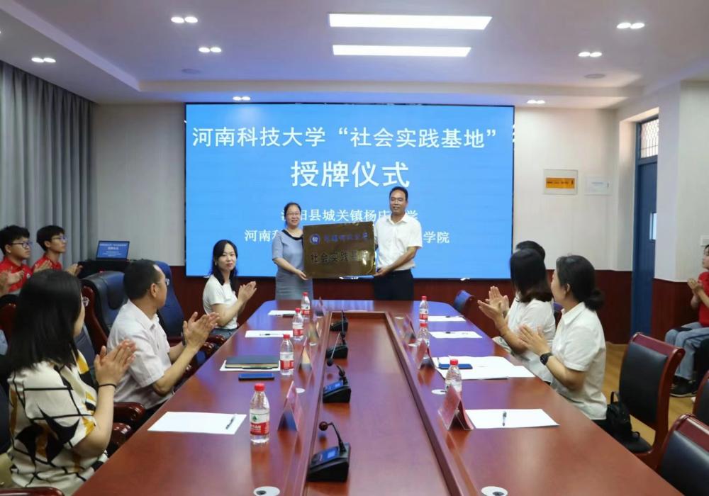 在杨庄小学会议室,举行了河南科技大学食品与生物工程学院大学生社会实践基地授牌仪式。河南科技大学食品与生物工程学院领导与汝阳县城关镇党委副书记刘佳、汝阳县城关镇杨庄小学校长范红宾以及实践队的指导老师和社会实践队全体成员参加授牌仪式。校领导代表表示将为社会实践团队提供的支持与帮助,并叮嘱社会实践团队师生在活动中注意安全,及时记录总结实践内容,进一步夯实实践成果。