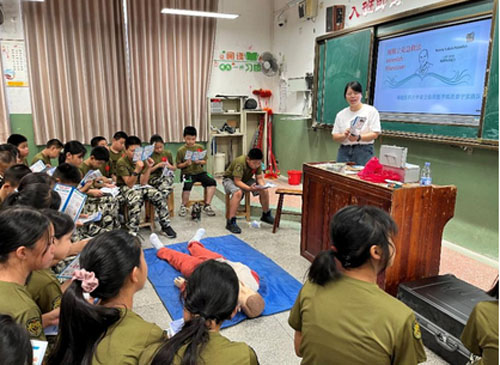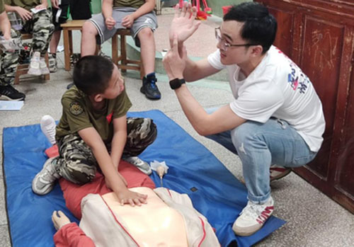 在急救课堂上,队员采以宣讲和实操互动相结合的形式,用通俗易懂的话语、生动的讲解以及示范互动,帮助孩子们了解和掌握急救技能。队员以情景模拟为引,带领孩子们认识急救的重要性,鼓励孩子积极思考,同时提供有趣好记的口诀,帮助孩子们掌握和记忆急救步骤。现场还利用模拟假人进行互动示范教学,逐一强调急救动作的要领,指出在操作中容易出现的错误动作。通过讲原理、抓实践、重互动的方式,力求帮助青少年真正掌握急救技能。