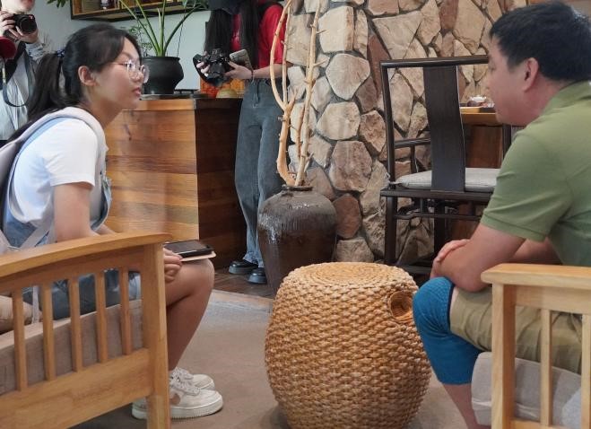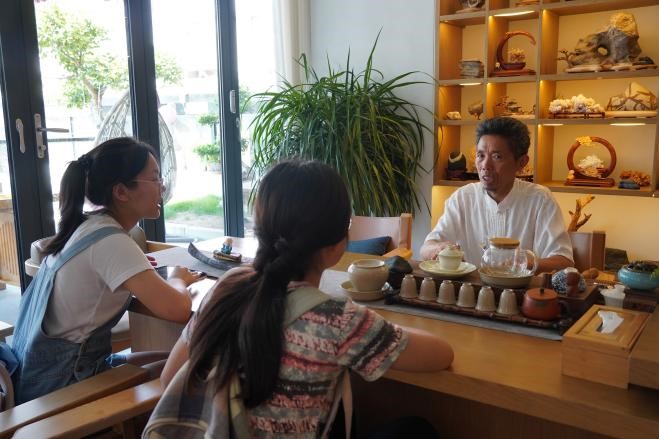 在余村青之恋咖啡馆参观的过程中,实践团成员和咖啡馆老板进行了交流,以寻找并研究全球合伙人项目在创业个体中的具体体现以及作用。据老板介绍,青之恋咖啡馆是由自家原有的老宅改建而成,为游客提供品茶、品咖啡以及住宿服务。屋内装修简朴自然,环境干净整洁,家具以及装饰品大多数为竹编织品,积极响应并实践着习总书记在余村提出的“绿色青山就是金山银山”理论。