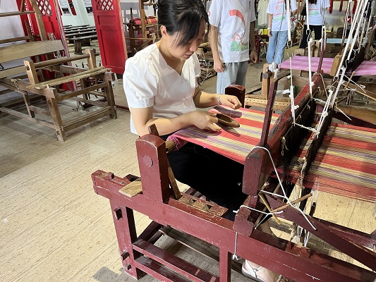 图为刘倩老师向团队成员演示粗布的基本制作原理及方法。