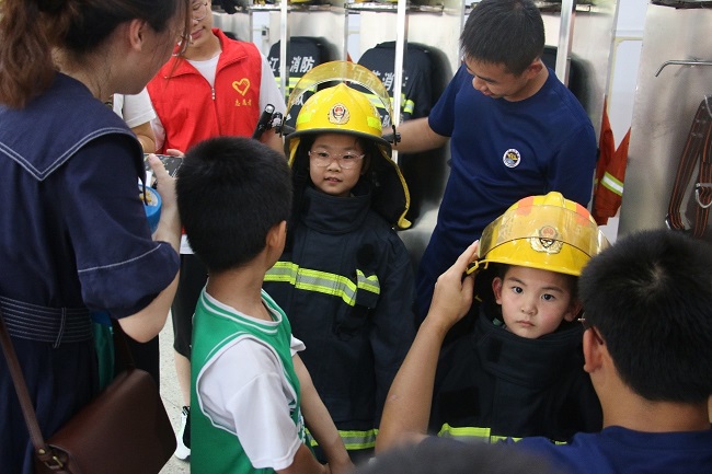 为真实感受消防装备的重量,体验消防员的日常工作,小朋友们体验试穿了消防服。在消防员的帮助下,部分孩子亲身试穿消防灭火战斗服,切实体验到消防员职业背后的艰辛,进一步加深了同学们对消防员的敬佩之心。