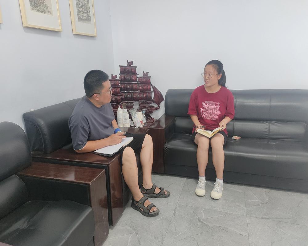 图为实践队员与老师探讨当前学校劳动教育课程开展情况。