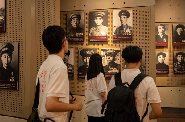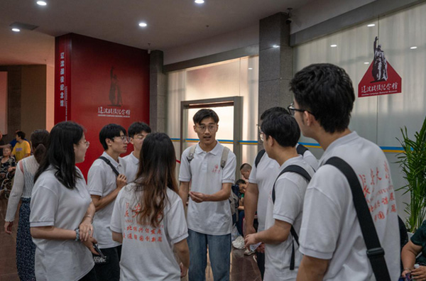为纪念辽沈战役胜利40周年,辽沈战役纪念馆于1988年在锦州烈士陵园内正式落成。7月25日上午,实践队来到纪念馆内,一入园区就被道路两侧刻有数万名东北解放战争革命烈士姓名的纪念碑所吸引。纪念碑前方屹立着东北人民解放军炮兵司令员朱瑞的塑像,他是解放战争期间我方牺牲的最高将领。东北解放战争的胜利为新中国成立作出重大贡献,解放战争革命烈士永垂不朽。