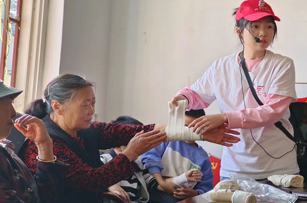 在石坝子村与居民们相互交流和调查过程中,有位叔叔跟我们讲本村的大多人们数都每天6点上山挖草药,蘑菇等,但由于地势险峻和树林密集等原因此过程中很容易手臂受伤,尤其擦伤、流血,所以我们团队特意利用一定时间讲解了伤口消毒和止血的理论知识,同时一对多的教学模式教授了包扎的实践操做。主要包括“环形包扎法”“螺旋型包扎法”以及“8字型包扎法”等多个适用于日常生活中的简单操作的急救方法。