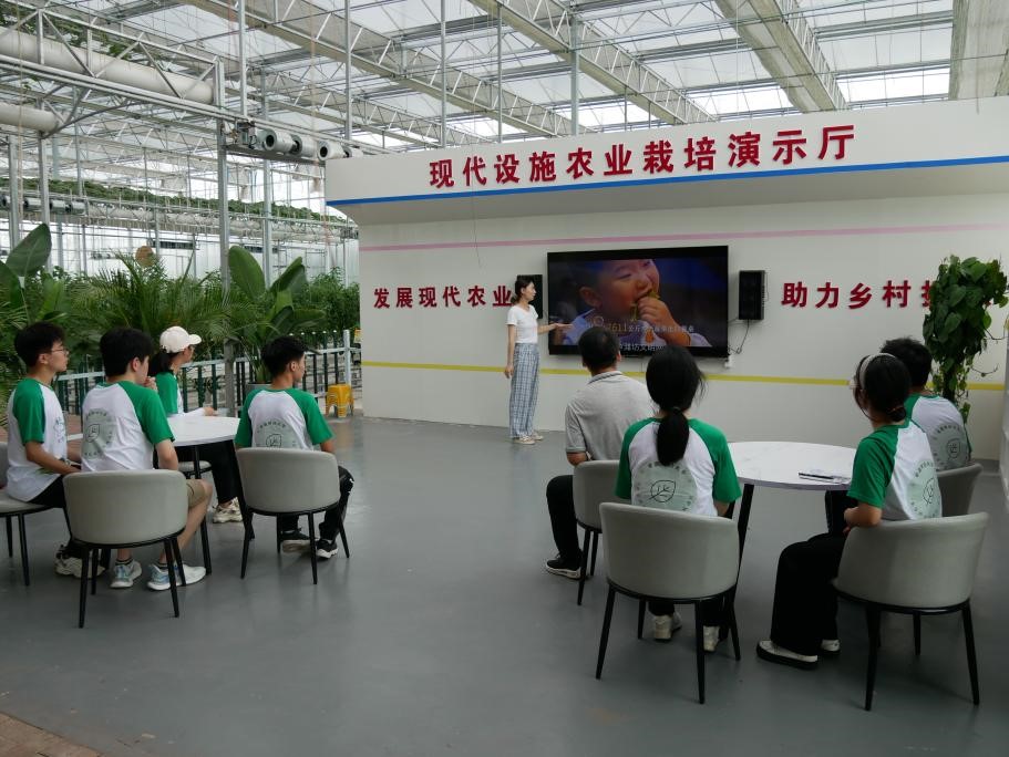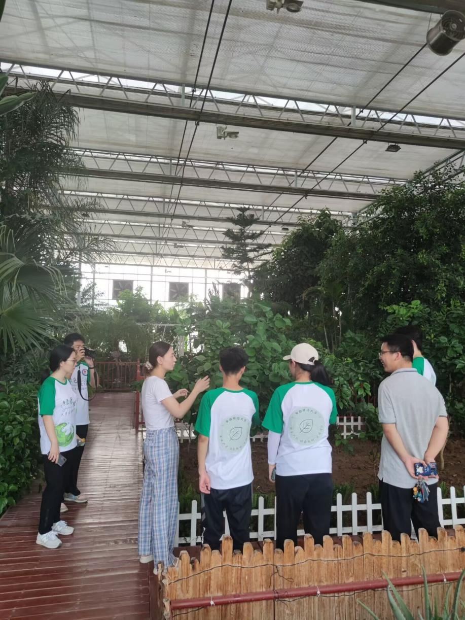 活动中,团队成员与指导老师在讲解员的带领下集中参观了园区劳动教育实践基地热带植物展示馆和高科技果蔬栽培展示厅。在热带植物展示馆内,团队观赏了来自不同产地、具有不同习性的热带植物。叶痕斑斑、古朴苍劲的苏铁蕨,美丽妖艳、五颜六色的马缨丹,洋洋洒洒、宛若屏风的锦屏藤等,在此汇聚一堂,惹人喜爱。在参观过程中,成员们发现工作人员可以通过手机智能监测植物的生长情况,及时地调整水分、养分,实现精准把控。这种充满“智慧”的新型科技成果能够实现节本增效、减少环境污染。在观赏结束后,成员们跟随讲解员学习设施农业动力控制系统,了解到馆内控制室温、集中灌溉、开窗通风等生产环节的运作原理。