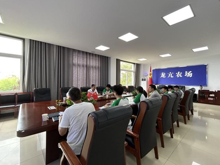 在参观完毕后,团队成员与农场负责人、专家开展座谈交流会。农场副书记周步亚从公司基本情况、生产经营、产业发展、服务乡村振兴等方面进行深入介绍,物联网技术专家何主任就农场大田物联网的应用领域与推广难题向成员们详细介绍。在交流环节中,师生们与农场负责人、专家积极互动,现场气氛热烈。成员们踊跃发言,向何主任提出“农业物联网是否具有节能减排效应”的问题。何主任耐心解答,从变量施肥、精量播种、少量用药三方面解释物联网技术产生的具体低碳效应。此外,成员们还学习到农业物联网可以就农产品质量追溯与农机施工效率两方面加强物联网技术的绿色效应。周书记表示,下一步农场将往农业节能减排方向迈力向前,着力改造农机设备,促进大田物联网技术的进一步应用与推广。