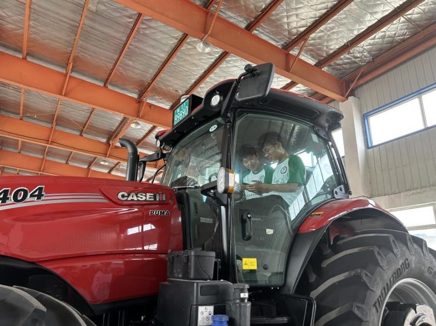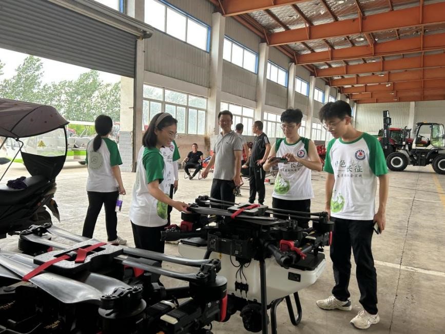 随后,团队成员跟随工作人员来到开心稻田,观赏到红花草生长做绿肥、水稻播种、有机肥料使用、人工拔草、稻鸭共生一系列水稻生产全过程。成员们纷纷下田查看水稻长势,体验农事插秧。通过与农民的交流,了解到开心稻田依托农业物联网优势,围绕“看得见”的食品安全,将物联网大田数据采集器和远程视频监控系统整合到微信公众平台,并展现给大众。这种模式下生产的有机稻米柔软滑润、富有弹性,且绿色安全。成员们纷纷表示,农业物联网技术不是浮于云端的看不见的技术,而是真真切切应用实际的新型农业技术。接着,团队来到了农机博览园。博览园展现了许多大型农田作业机械,例如拖拉机、水稻收割机、播种机、植保无人机等。讲解员为成员们详细讲解了各种农业机械的应用原理和应用情景,成员们认真学习、虚心请教。“无人机对大田灌溉是非常重要的,在后台精准定位哪一块甚至哪一株水稻缺水或者养料后,就会派无人机过去洒水,这样就不需要人工一一洒水。”讲解员说道。成员们受益匪浅,发现新型的农业物联网设备对农业的低碳绿色发展产生了显著作用。