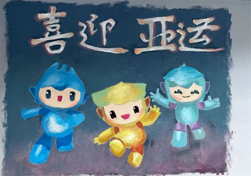 7月6日至10日,甬行马小队在宁波市马园社区的一块白墙上,进行了以喜迎亚运为主题的墙绘活动。通过与宁波市马园社区负责人的协商,选择以亚运会三个吉祥物为绘画主体,传播“江南忆”文化符号,增加社区空白墙体可承载的文化传达价值与环境美化价值。甬行马小队先从市场上细心挑选和购买适合墙绘的工具,并与社区工作人员讨论绘画素材。为更好帮助社区居民知晓关于墙绘活动的目的,队员们会对驻足观看墙绘活动的社区居民进行亚运活动的介绍,并认真倾听居民的建议。同时,社区居民对美化墙体,增加迎接亚运会文化符号,建设文明社区环境表达了大力的支持与感谢,激励队员们更加努力的进行墙绘活动。在高温环境下,甬行马小队的队员们分工合作,努力克服气温困难,进行墙绘草图的勾勒、色彩选择、颜料填铺、细节优化,一步步完成了对于社区墙面的美化,以此更好的体现了宁波市马园社区迎接亚运会的文化氛围。队员轮流拍摄了墙体绘画的过程,并且把五天的绘画实践活动剪成视频为了更好的记录此次墙绘活动,作为社会实践活动的宣传片也增添活动的纪念意义。