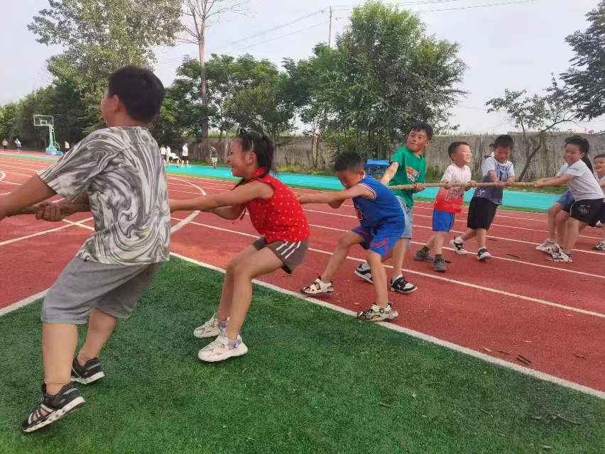 首先,开展的项目是短跑比赛,在“预备:跑!”一声令下,孩子们像离弦的箭冲向终点,你追我赶,勇争第一;在休息间隙,六年级的孩子开始了足球比赛,随着主裁判的一声哨响,两队开始了激烈地拼抢,在两队的共同努力下,两队不相上下,都取得了较为优异的成绩;接着,开展的项目是接力折返跑,孩子们自由组队,根据自己的跑步速度自行分配不同节点的人选,接力跑往往需要考量小队伍的团结和配合能力,四个队伍的接力跑速度相差不大,每个小团队都在为共同的胜利而团结互助、一起努力;随后,开展的是“一二三木头人”和“趣味跳绳”活动,一二三年级与四五六年级分别开展。“一二三,不许动!”听着一声声口令,孩子们时而向前冲,时而立在原地,欢声笑语常常萦绕在耳畔。哨声一响,紧张的跳绳比赛拉开了帷幕,每位参赛的学生都使出浑身解数,超越自我,跳出了自己的好成绩。最后,开展的是“拔河”比赛,支教队成员将学生根据身高体重划分为两个小组,在一声声口号中,每个孩子都紧紧地拉住绳子,身子往后倒,脚站成弓步,听到“比赛结束”的口令,孩子们松开绳子,坐在地上,交谈着比赛的所感。