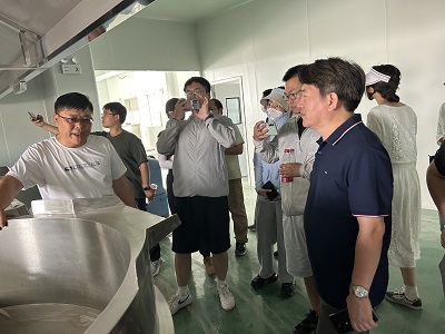图为辣椒生产厂工作人员向团队介绍生产工艺流程