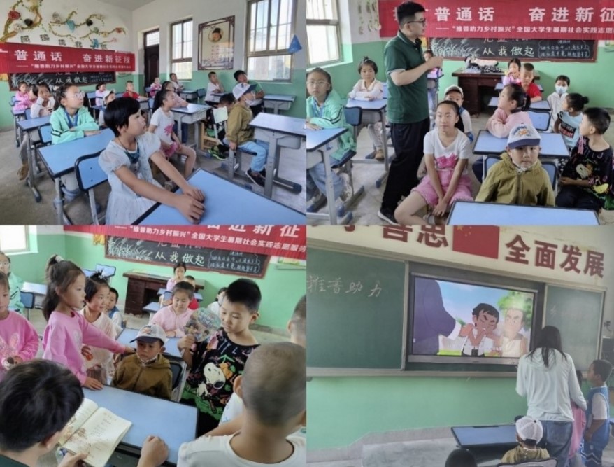 大学生实践团队为小学生们筹备了一节生动有趣的推普课。通过讲解生活中的用电安全小常识,大学生们为小朋友普及用电安全知识、讲解常用工具的正确发音;以经典诗文朗诵引导学生正确发音、学习传统经典;组织开展红色动画作品配音大赛,激发学生的爱国热情、培养普通话使用习惯。并通过“击鼓传花:我用普通话讲故事”小游戏,激发小学生学习使用国家通用语言文字的热情和兴趣。