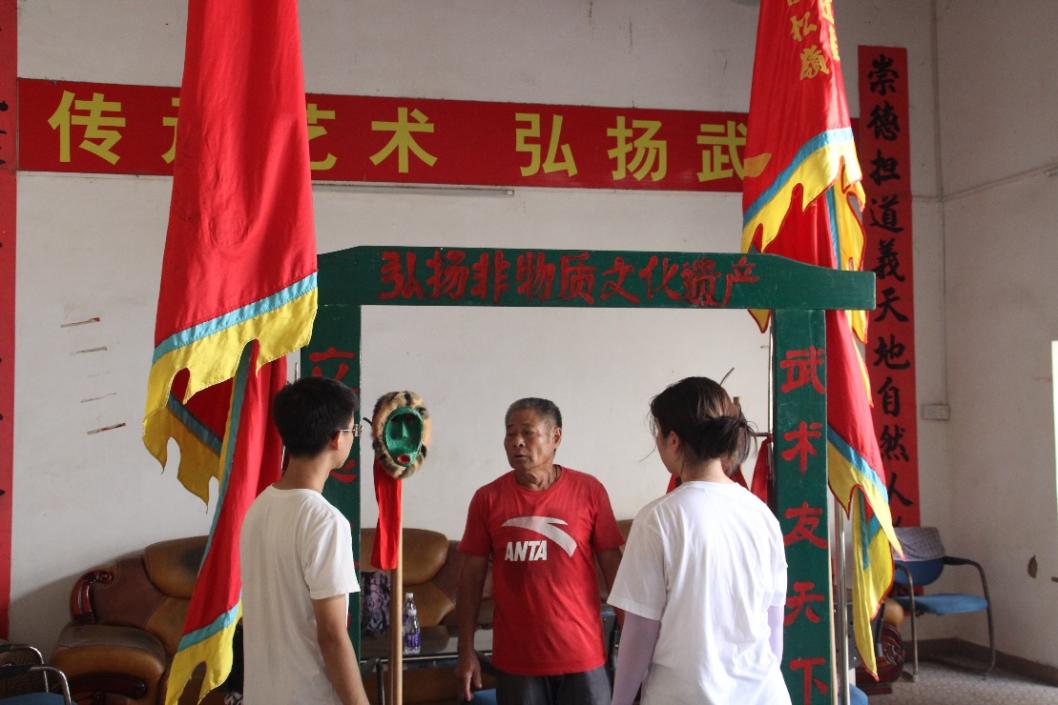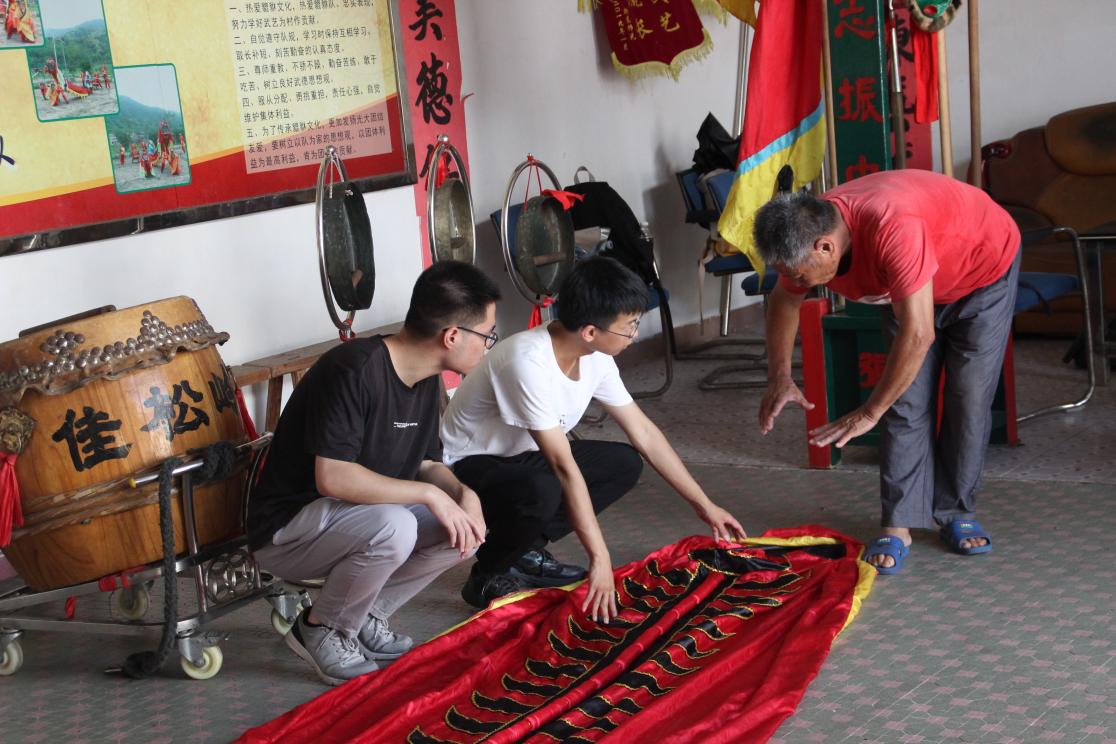 随后,在村干部的带领下,地理科学学院熠启服务队前往佳松岭貔貅培训基地实地调研,这是广东省非物质文化遗产传承基地,也是当地保存和传承貔貅文化的重要场所。在基地里,服务队见到了佳松岭貔貅的第五代掌门人——张永木师傅。张永木师傅详细介绍了貔貅的历史渊源和文化内涵:“貔貅作为中国古老的传统文化之一,具有辟邪驱鬼、保护家宅的寓意。我们的祖辈曾说貔貅是神兽,能带来好运和祥瑞,所以在重大节日或喜庆时刻,我们都会舞貔貅来祈福。舞貔貅是我们村最重要的非物质文化遗产之一,代代相传,因此我们也希望让更多的人学习和传承这门文化。”