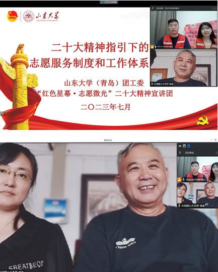 为学习领会习近平总书记关于青年工作的重要思想,推动党的二十大精神深入人心,山东大学(青岛)团工委“红色星幕·志愿微光”二十大精神宣讲团走进企业、志愿服务中心开展宣讲、访谈等实践活动。