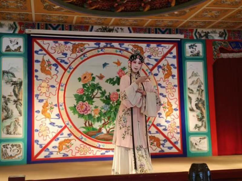“原来姹紫嫣红开遍,似这般都付与断井颓垣。良辰美景奈何天,赏心乐事谁家院?朝飞暮卷,云霞翠轩;雨丝风片,烟波画船。锦屏人忒看的这韶光贱!”团队成员刚一落座,奏乐声便响起,表演的正是节选《牡丹亭·惊梦·拾画》。600年来,五尺高台,那教人柔肠百转、心灵震颤的曲词,一字一句,唱出了风花雪月,道出了人生百态。动人心弦的配乐与台上演员配合得天衣无缝,当杜丽娘从门帘入场那一刹,仿佛莺啭鸟啼扑面而来。她的身段、步法、手势引人入胜,恍惚间满园的春色在眼前铺开;她的嗓音清冽干净,让人惊叹,如舞美般极其简单,却又恰恰暗合“一生爱好是天然”的人物形象。而柳梦梅游园时,脚下一滑的动作把一个痴书生演出了十分可爱;几步身段更让人不禁拍案叫绝。“台上一分钟,台下十年功”这句话实实在在凝练于那举重若轻的几步之中。