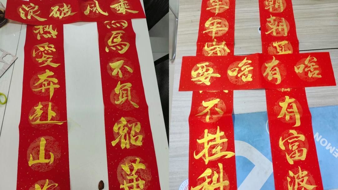 在“德智体美劳”这一看似普通而又极其重要的教育中,美育无疑占据了不可或缺的一部分。其中,春联作为中国传统文化的重要组成部分。为了更加深入了解春联这一文化,我们“弦歌不辍,薪火相传”实践团特意去拜访了写春联的老师,老师十分热情的接待了我们,同时我们也了解了很多关于春联的起源故事,掌握了春联的书写规则,并且在老师的耐心指导下,实践团的小伙伴们各自创作出独一无二的春联作品,并且分发给了其他小伙伴。